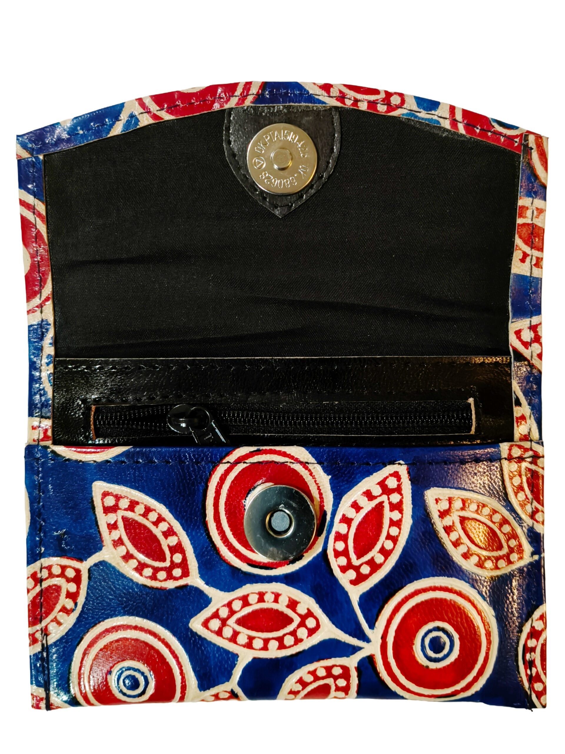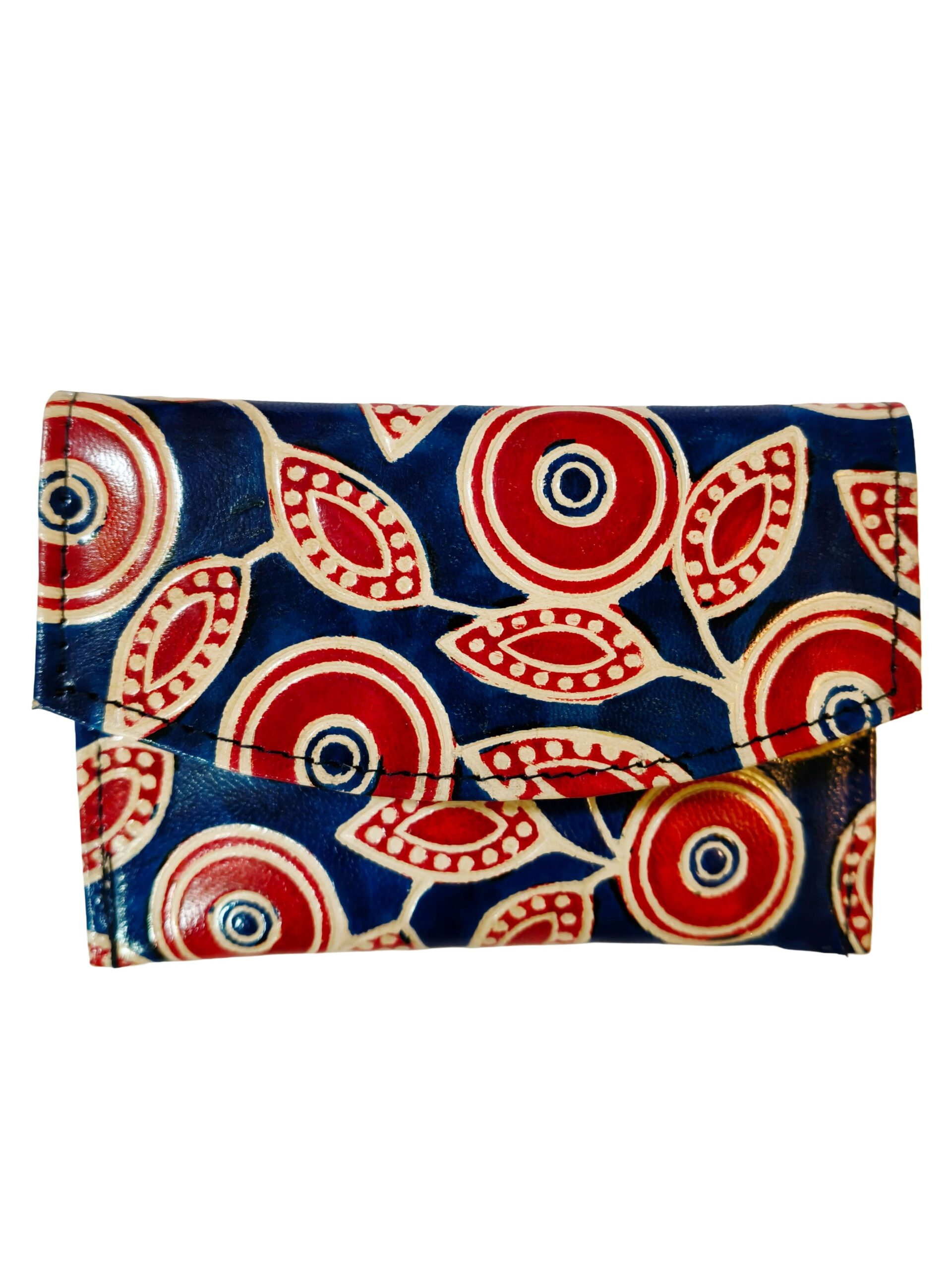 The Shantiniketan 5.5-inch clutch is a beautifully handcrafted leather accessory that showcases the rich artistic heritage of Shantiniketan, West Bengal, India. Known for its intricate embossing, vibrant colors, and traditional Indian motifs, this clutch is both stylish and practical.